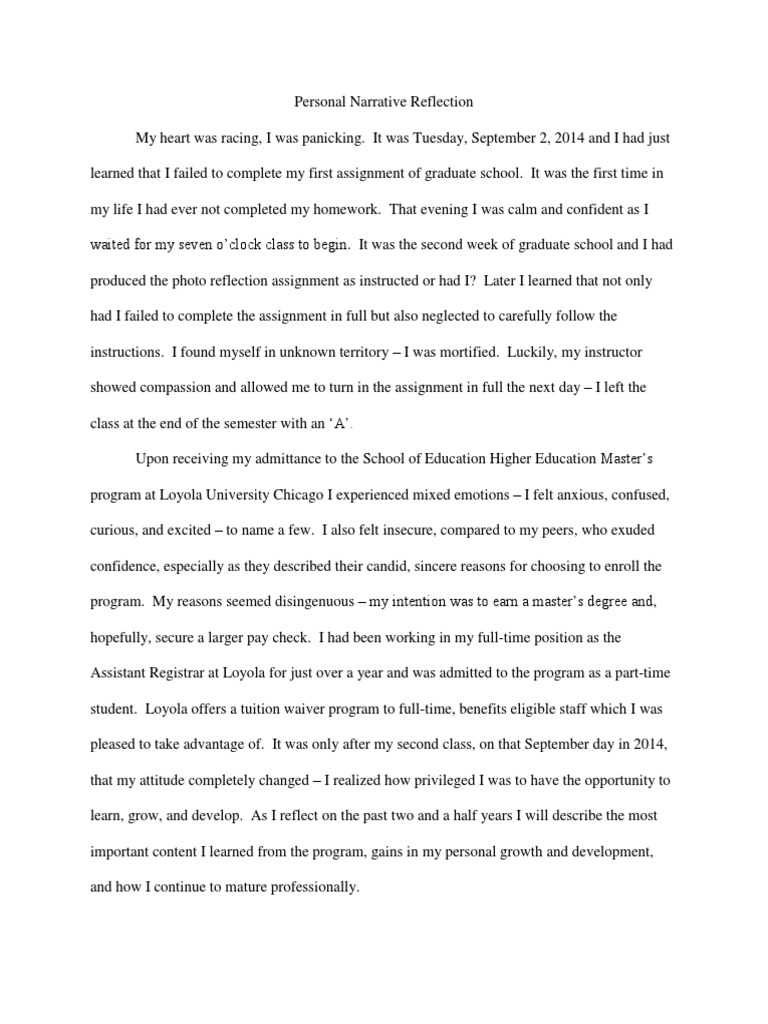 Jul 07, · A personal narrative is a style of writing that describes someone's experiences. Many teachers use personal narratives as an assignment to encourage creative, free-flow writing. Personal narratives also can encourage students or writers to further develop writing and reflection skills Writing a Personal Narrative Beginning of a Personal Narrative. The beginning of a personal narrative should include the necessary setup of your Middle of a Personal Narrative. In the middle of your narrative, you should describe your actions and the actions of End of a Personal Narrative. The Personal Narrative: Personal Reflection. Throughout the duration of this class, I have been highly reflective on my work, but have failed to take into consideration past mistakes when developing new assignments. From the Personal Narrative Essay to the Destination Essay, common errors have take place amongst them all